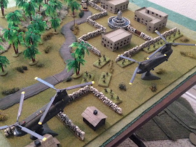 The opposing forces, with regime troops on the left and CLA troops on the right. The CLA are made up of US troops from Pendraken's Vietnam range, while the Castro forces are made up of Argentinians from Pendraken's Falklands range. The BTRs are from Minifigs, while the Panhard is also from Pendraken's Falklands range.