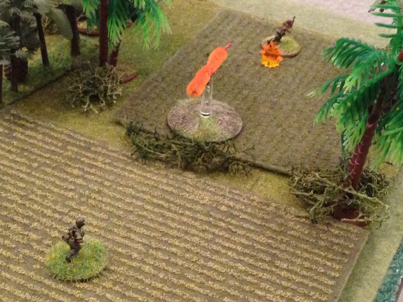 The rounds miss (far right explosion) and the Cuban moves up (center top right, next to trees), while Lt Jaramiho (just to his left, with one more Cuban at far left) shoulders his rifle and returns fire...