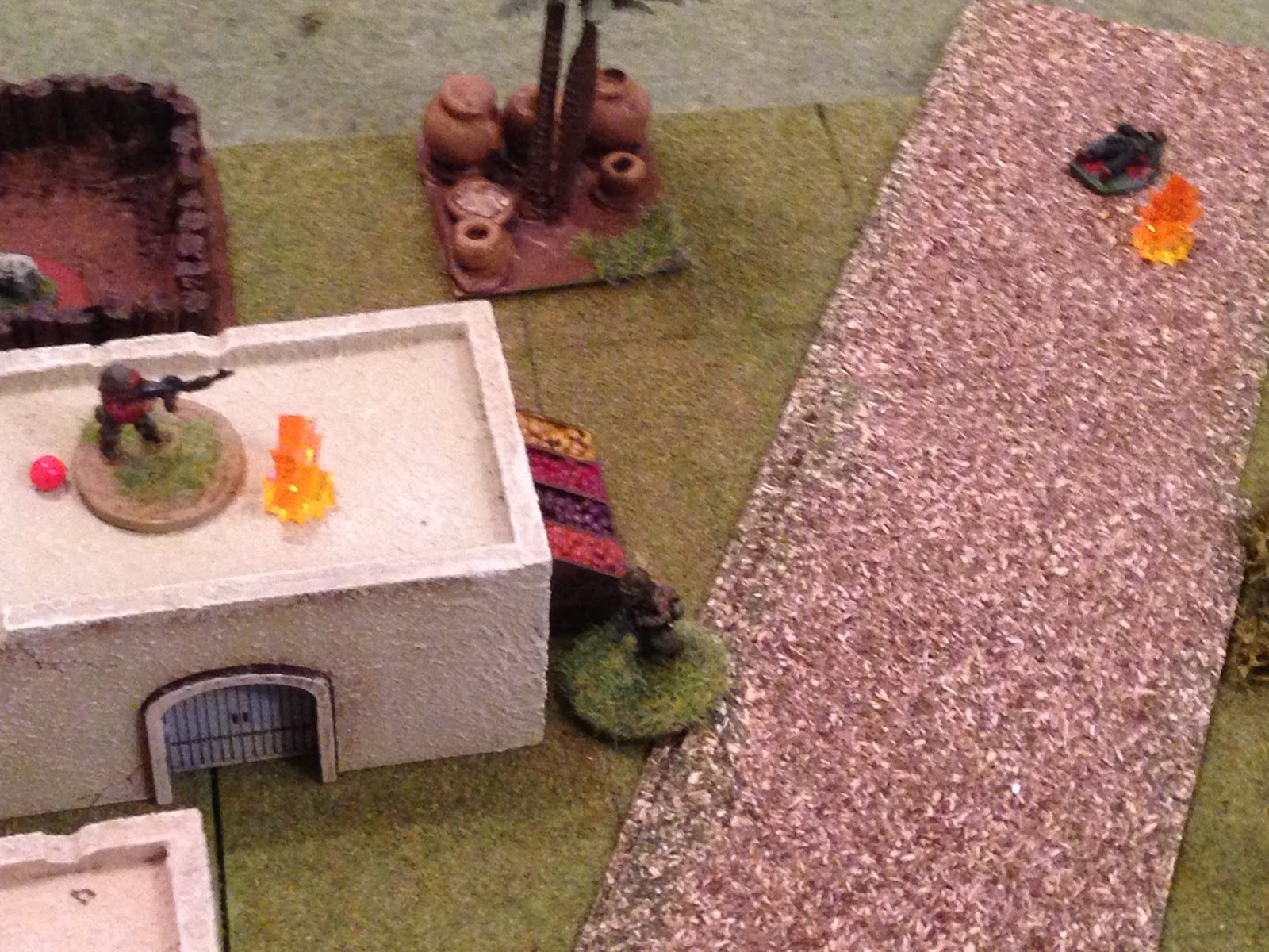 This is the northwest corner of the table, and it is owned by the bad guys, who have four men visible. That's an RPG at top left, a PK machine gun at top center, and two riflemen (top right and bottom right).