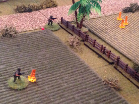 The bad guys are down to two men still in the fight: the RPG gunner dashes forward to rally his pinned buddy (top left), figuring the knocked down Cuban rifleman at far right ain't going anywhere. Similarly, the bad guys have a knocked down guy in the northwest corner of the table (the PK gunner), with no hope of getting past the Cubans to rally him.