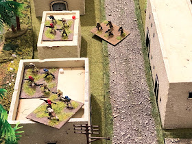 But the Commies (bottom left) were jsut playing possum, and when they saw the Cubans pop onto the roof they fought like a mother protecting her cubs, throwing Hammer 02 back into the street (red bead at center), suppressed! Major Chavez and Hammer 03 (atop Post Office, top left) couldn't believe their eyes!